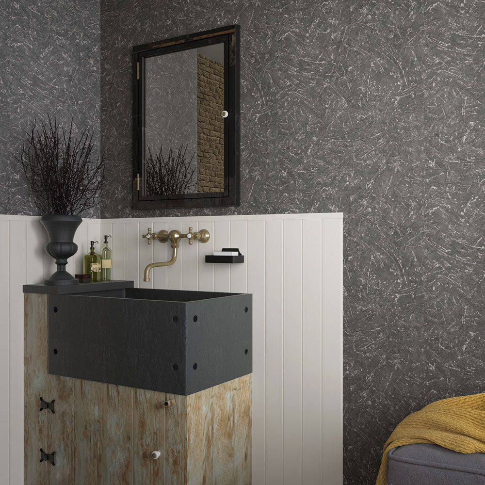 Vliesová tapeta s vinylovým povrchem, černo-šedá stěrková textura.