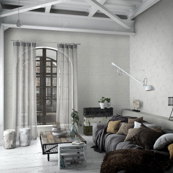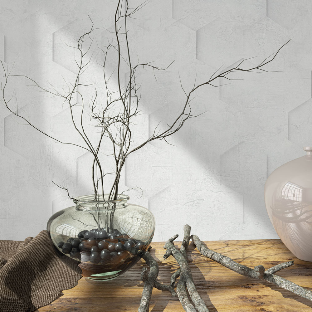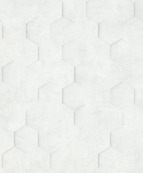 Vliesová tapeta s vinylovým povrchem, bílo-šedá, strukturovaná, částečně setřené hexagony s 3D efektem.