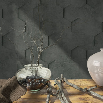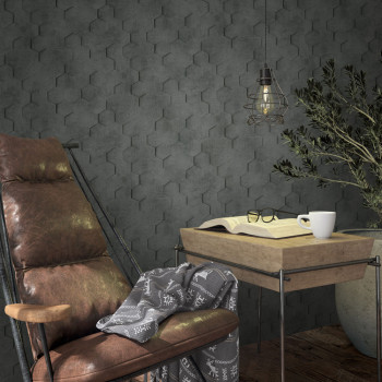 Vliesová tapeta s vinylovým povrchem, černá, strukturovaná, částečně setřené hexagony s 3D efektem.