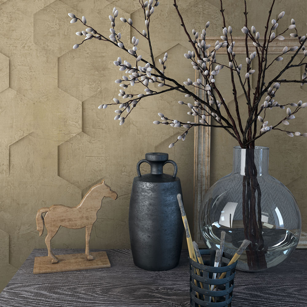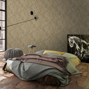 Vliesová tapeta s vinylovým povrchem, béžová, strukturovaná, částečně setřené hexagony s 3D efektem.