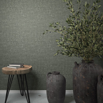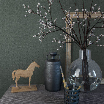 Vliesová tapeta s vinylovým povrchem, hrubší šedo-zelená látková textura.
