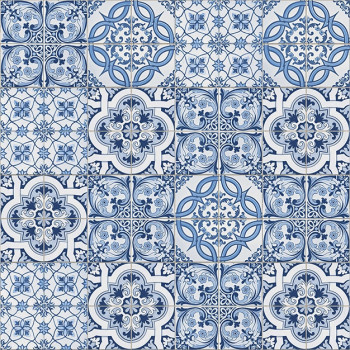 Modro-bílé ornamentální mozaikové obklady na vliesové tapetě na zeď.