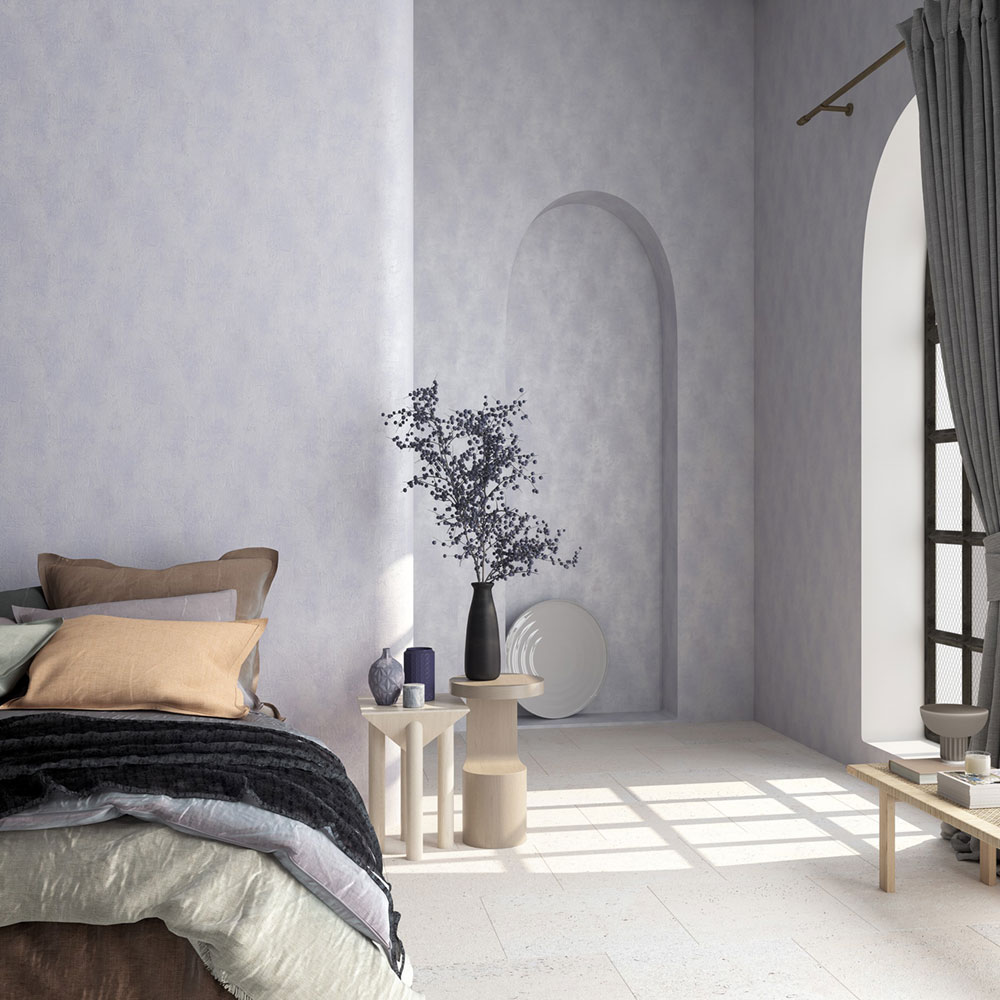 Vliesová tapeta s vinylovým povrchem, světle fialová, jemná stěrková textura.