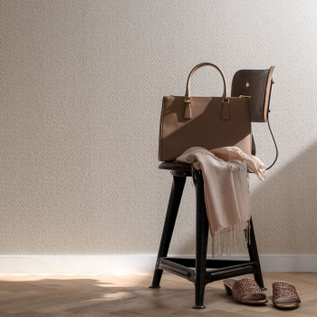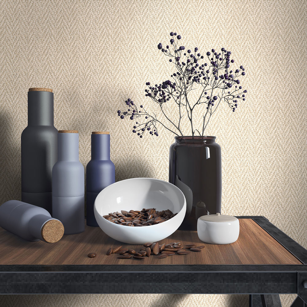Vliesová tapeta s vinylovým povrchem, hrubší krémovo-šedá látková textura.
