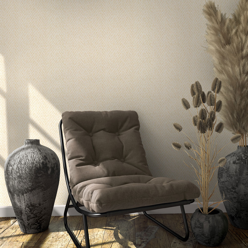 Vliesová tapeta s vinylovým povrchem, hrubší krémová látková textura.