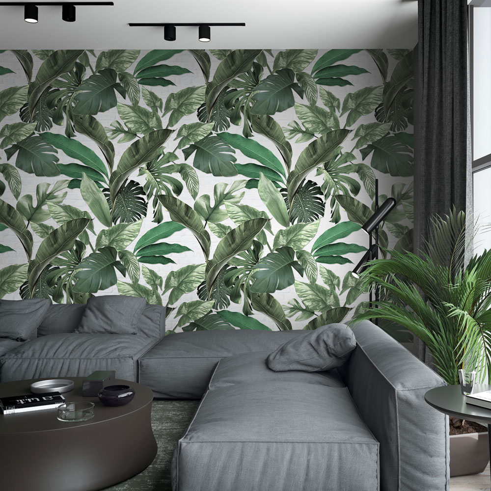 Vliesová obrazová tapeta s vinylovým povrchem, dekor listů, na pozadí šedá cihlová stěna.
