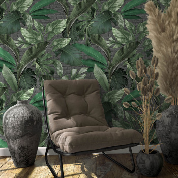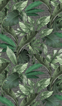 Vliesová obrazová tapeta s vinylovým povrchem, dekor listů, na pozadí šedo-černá cihlová stěna.