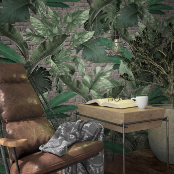 Vliesová obrazová tapeta s vinylovým povrchem, dekor listů, na pozadí šedá cihlová stěna.