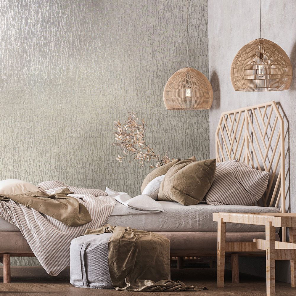 V kolekci objevíte reliéfní listy tvořící souvislé plochy, jemné lesky na lněné struktuře, elegantní motivy jeřábů nebo vzory připomínající skládané látky. Barevná paleta se pohybuje v neutrálních, přírodních tónech, které nechají vyniknout materiál i strukturu.