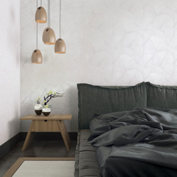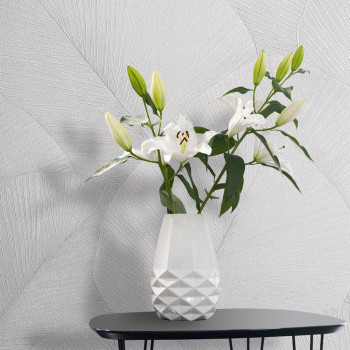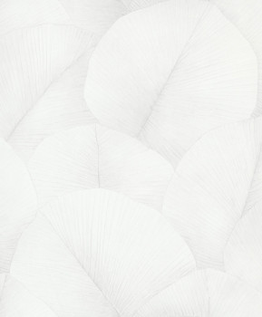 Vliesová tapeta s vinylovým povrchem, bílá, jemně plastický vzor listů.