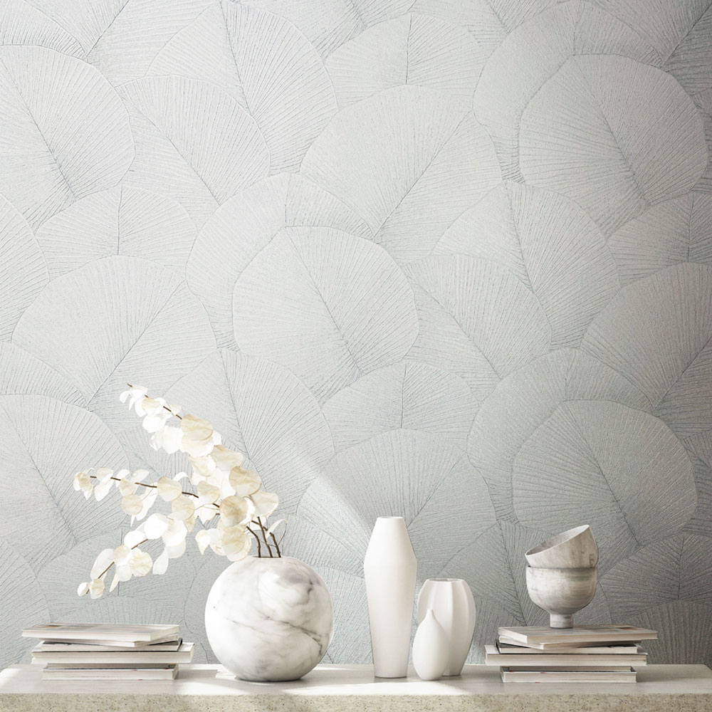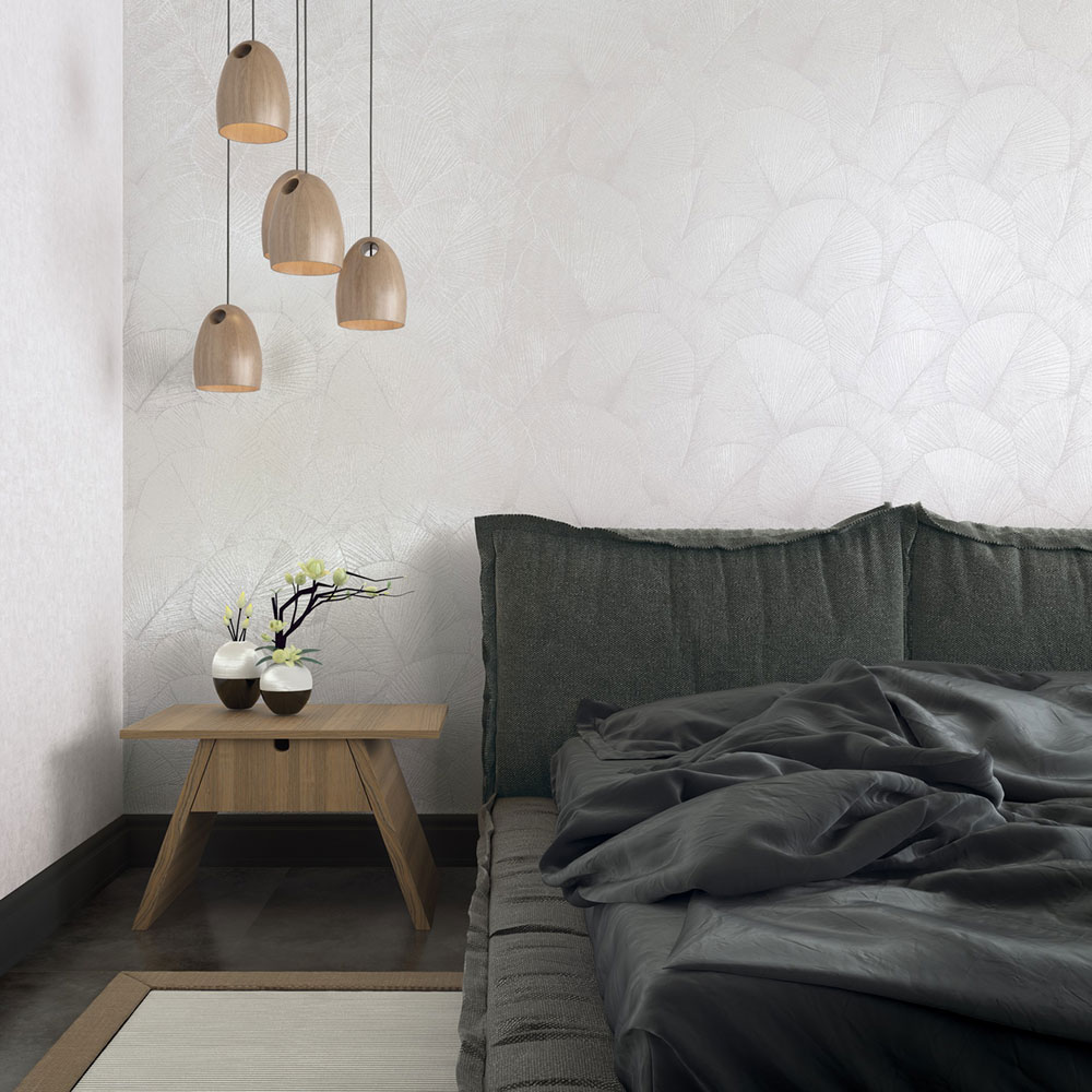 V kolekci objevíte reliéfní listy tvořící souvislé plochy, jemné lesky na lněné struktuře, elegantní motivy jeřábů nebo vzory připomínající skládané látky. Barevná paleta se pohybuje v neutrálních, přírodních tónech, které nechají vyniknout materiál i strukturu.