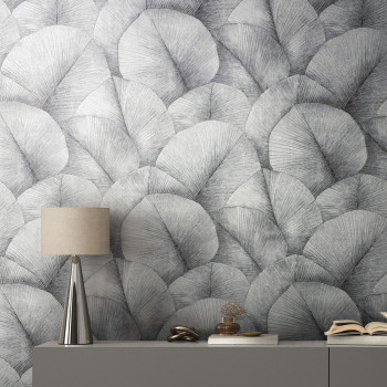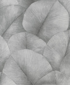 Vliesová tapeta s vinylovým povrchem, šedo-černá, jemně plastický vzor listů.
