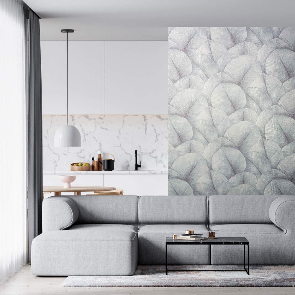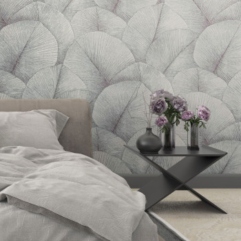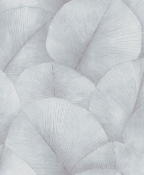 Vliesová tapeta s vinylovým povrchem, odstíny šedo-modré, jemně plastický vzor listů.