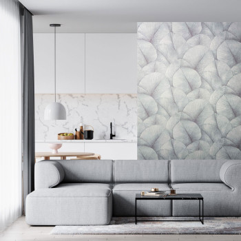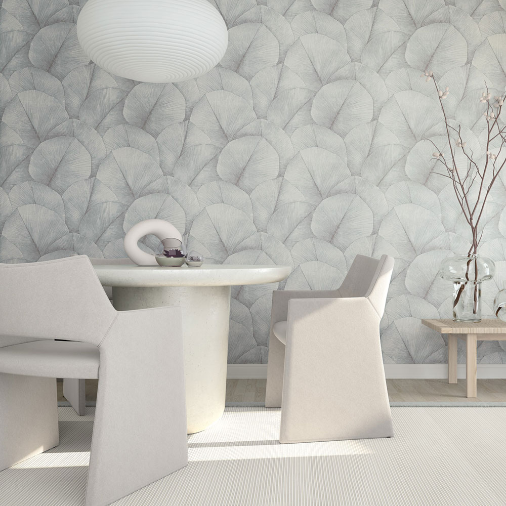 V kolekci objevíte reliéfní listy tvořící souvislé plochy, jemné lesky na lněné struktuře, elegantní motivy jeřábů nebo vzory připomínající skládané látky. Barevná paleta se pohybuje v neutrálních, přírodních tónech, které nechají vyniknout materiál i strukturu.