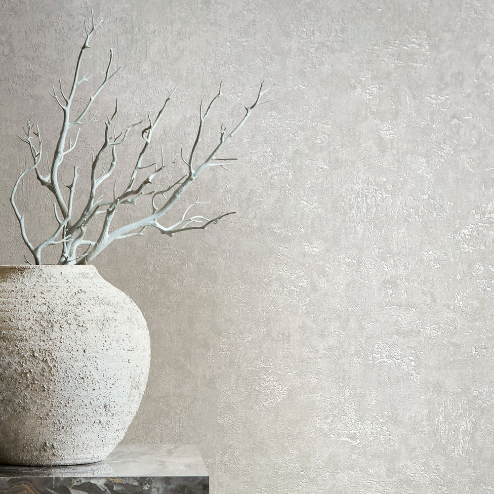 Vliesová tapeta s vinylovým povrchem, odstíny šedé, vzhled štukové omítky.