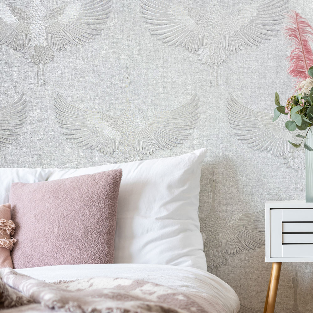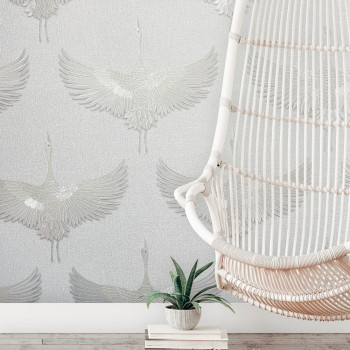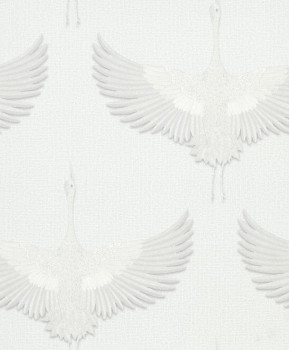Vliesová tapeta s vinylovým povrchem, bílá / slonová kost, motiv letících volavek, podklad hrubší textilní struktura, vzor evokuje pololesklou výšivku.