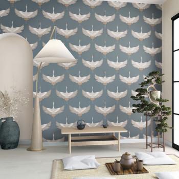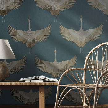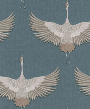 Vliesová tapeta s vinylovým povrchem, podklad hrubší modrá textilní struktura, hnědo-béžový motiv letících volavek vzor evokuje výšivku.