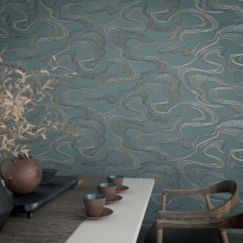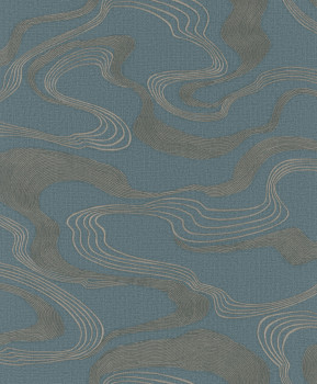 Vliesová tapeta s vinylovým povrchem, hrubší modrá textilní struktura, pololesklý hnědý a antracitový vlnkový vzor.