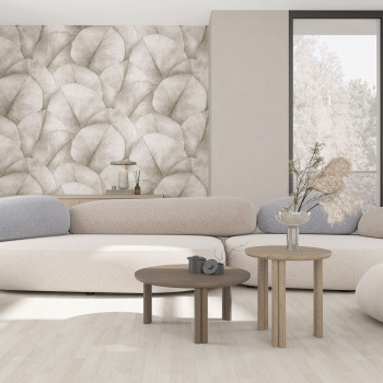 Vliesová tapeta s vinylovým povrchem, motivy listů v hnědo-béžových odstínech.