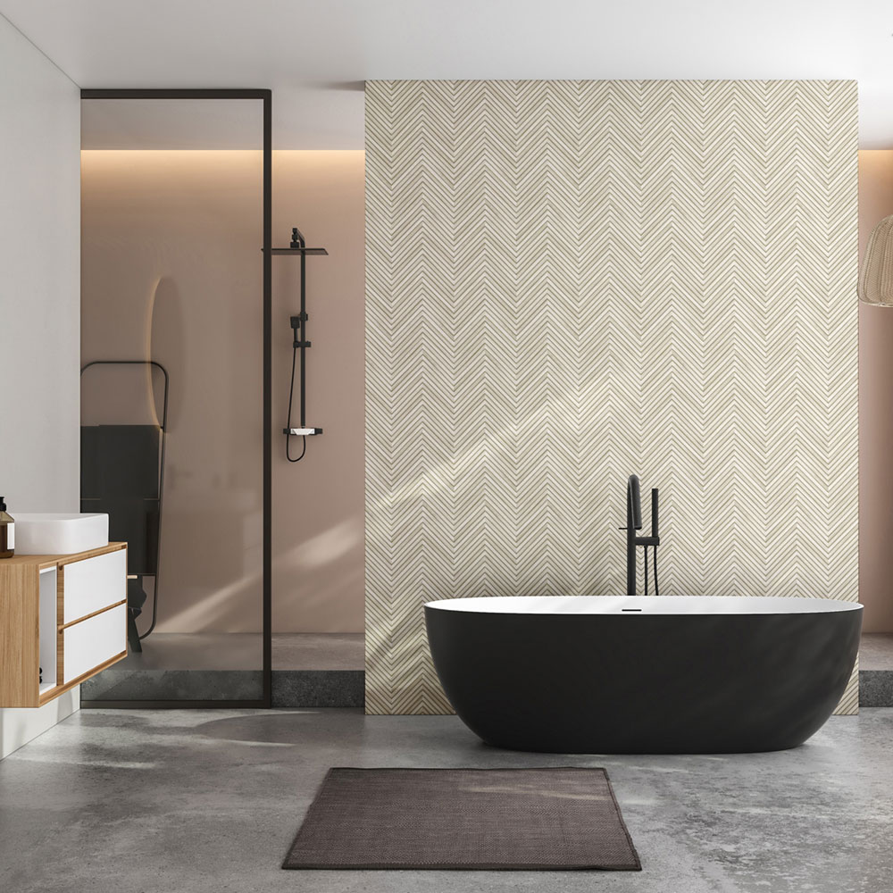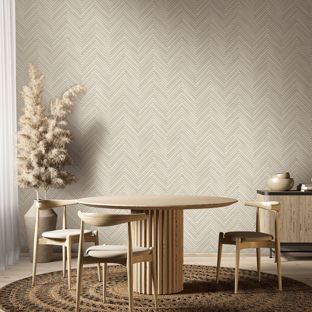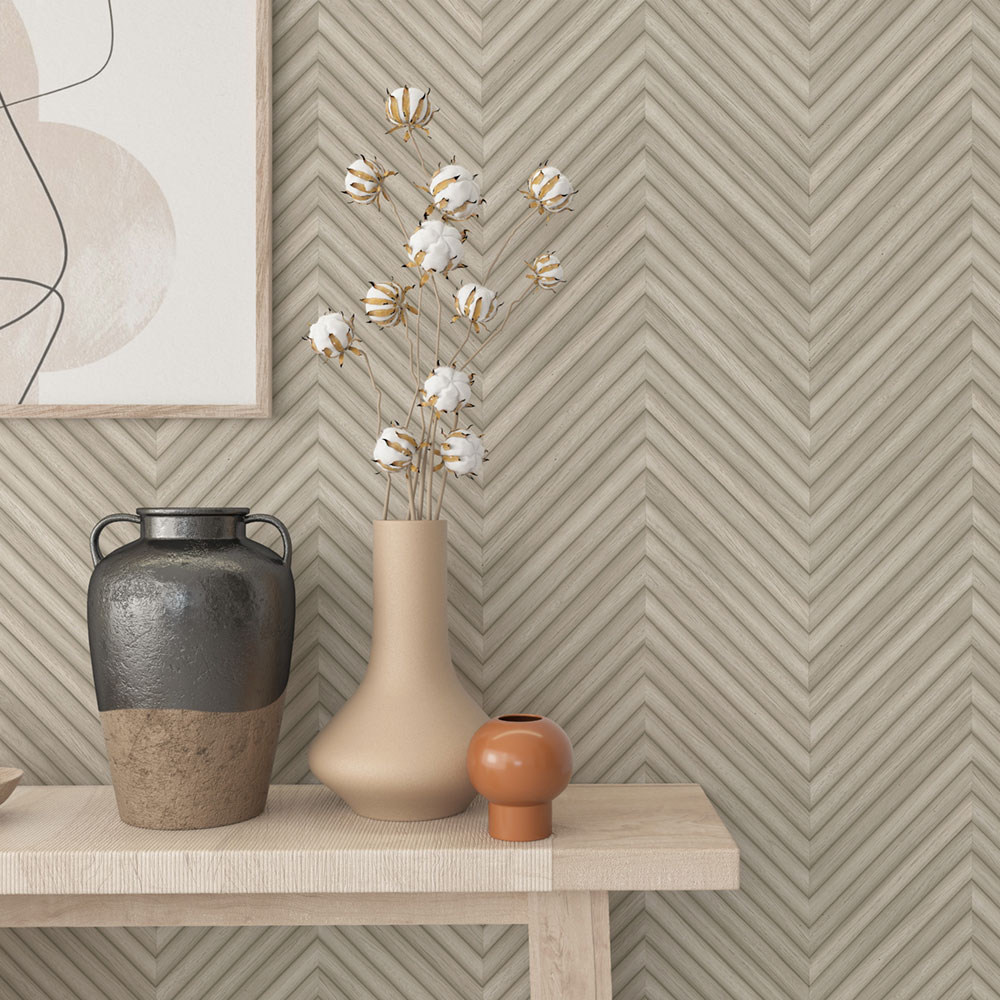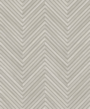 Vliesová tapeta s vinylovým povrchem, vzhled dřevěného cik cak obložení, odstíny krémovo-šedé.