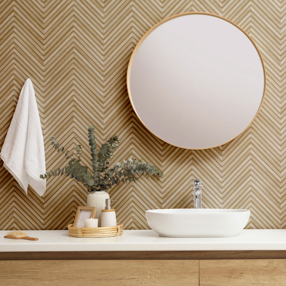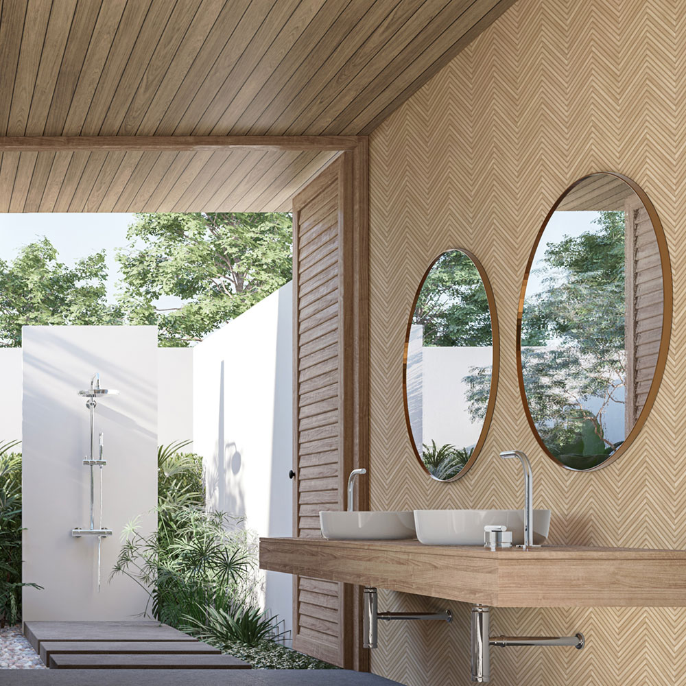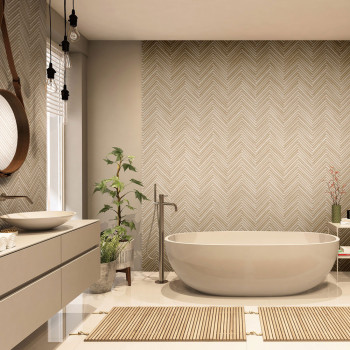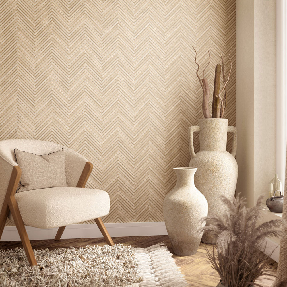 Vliesová tapeta s vinylovým povrchem, vzhled dřevěného cik cak obložení, odstíny béžové.