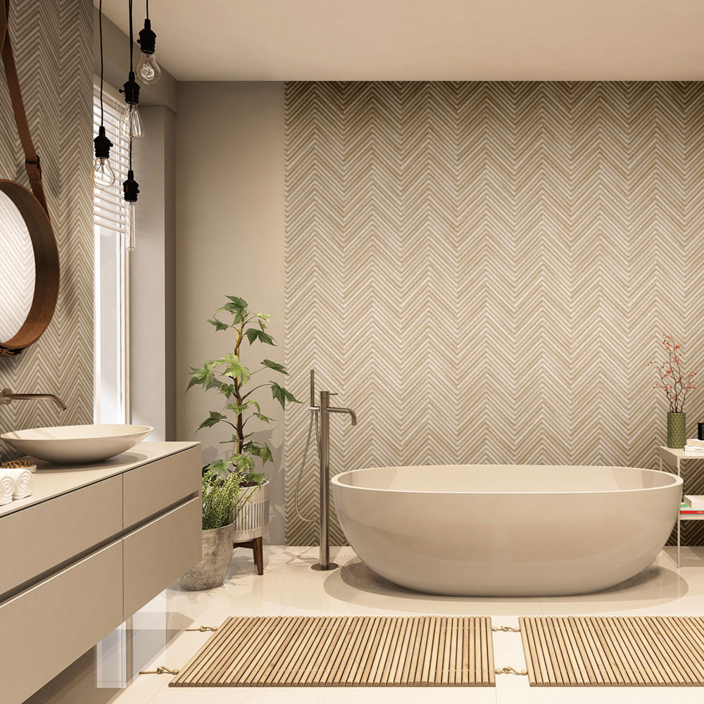 Najdete tu motivy inspirované italským travertinem, vzory připomínající lamely, kamenné bloky nebo lněnou strukturu. Barvy se drží v přírodních tónech – béžové, šedé, krémové i jemně pískové odstíny. Díky tomu působí klidně, elegantně a snadno se kombinují s moderním i klasickým interiérem.