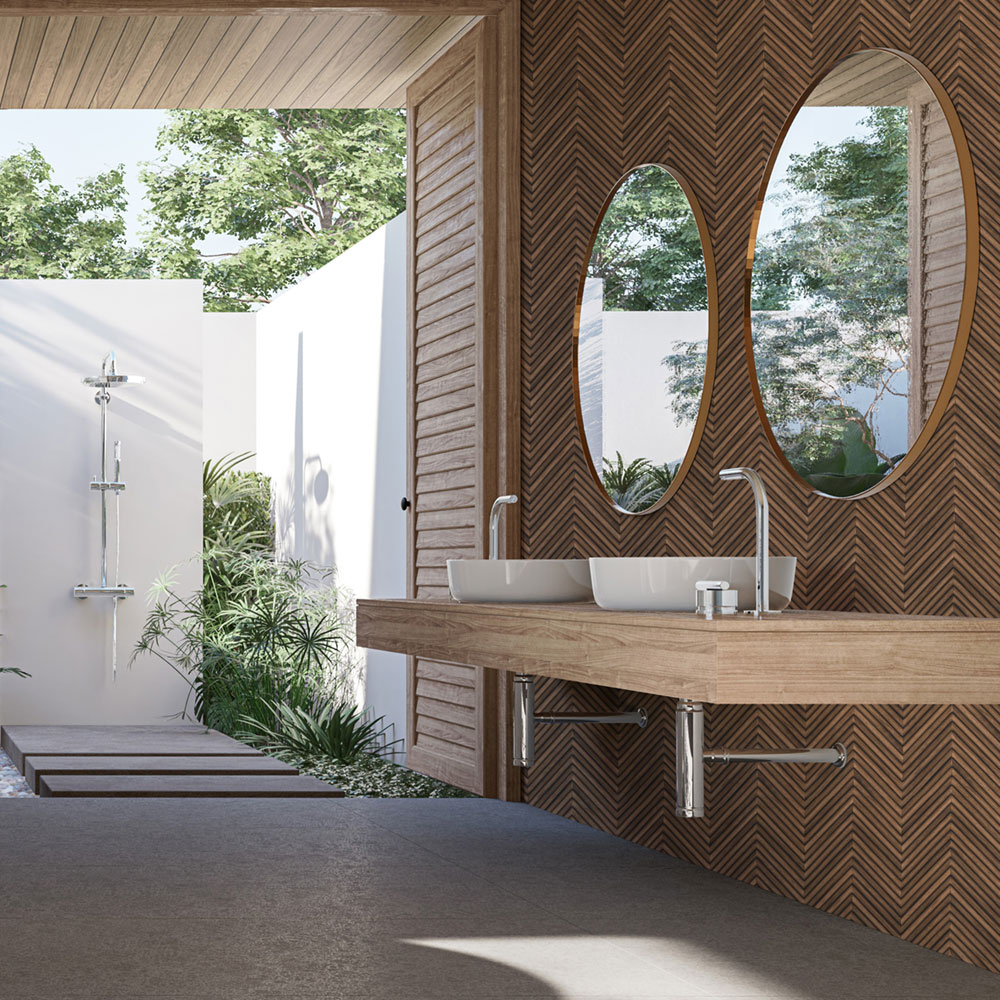 Najdete tu motivy inspirované italským travertinem, vzory připomínající lamely, kamenné bloky nebo lněnou strukturu. Barvy se drží v přírodních tónech – béžové, šedé, krémové i jemně pískové odstíny. Díky tomu působí klidně, elegantně a snadno se kombinují s moderním i klasickým interiérem.