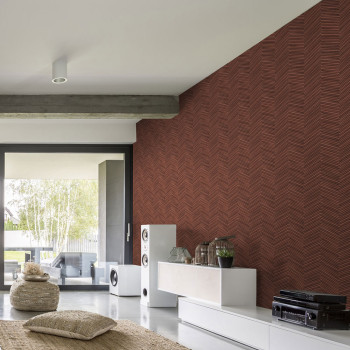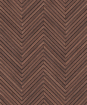 Vliesová tapeta s vinylovým povrchem, vzhled dřevěného cik cak obložení, odstíny hnědo-červené.