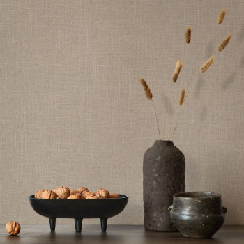 Vliesová tapeta s vinylovým povrchem, vzhled textilie, odstíny hnědé, jemná textura.