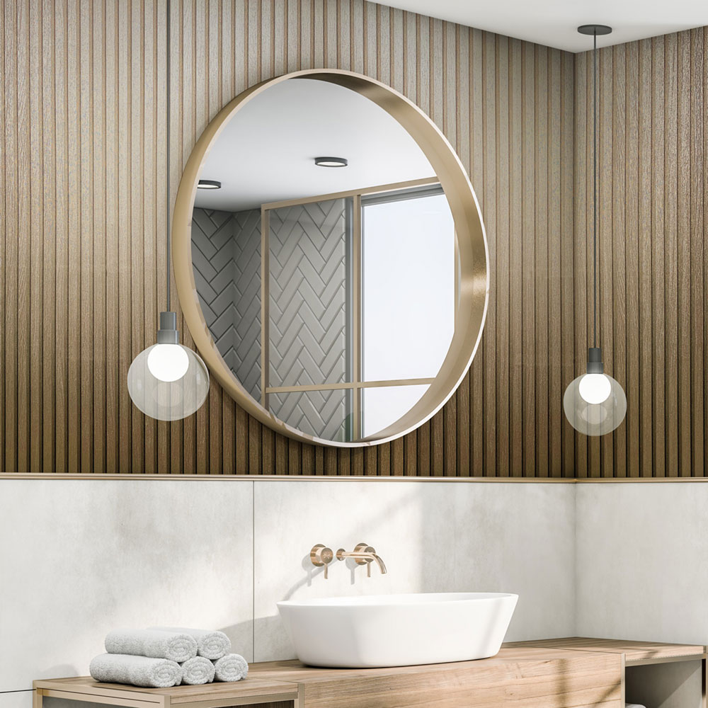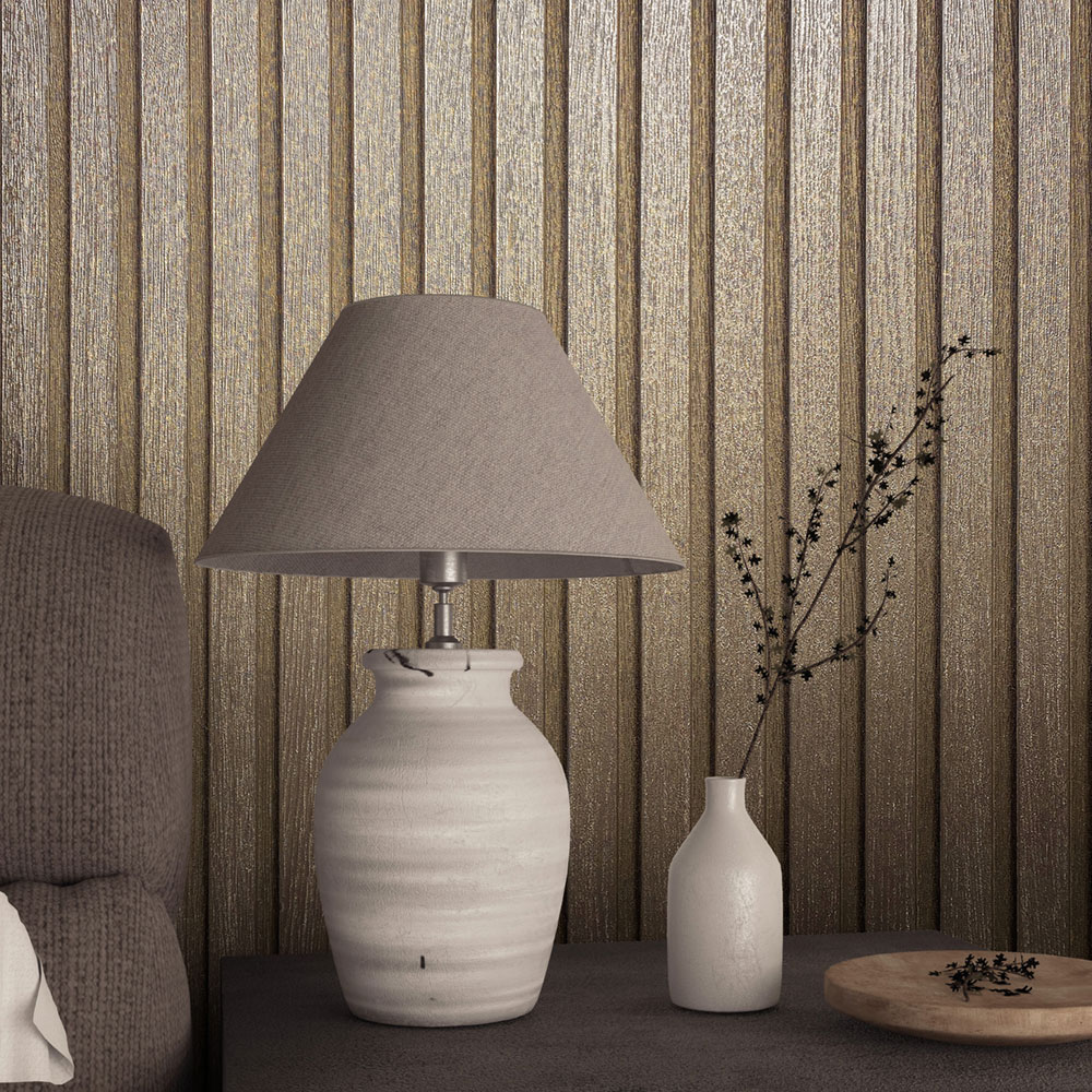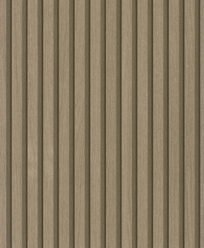 Vliesová tapeta s vinylovým povrchem, autentický vzhled lamelového obložení, 3D efekt, širší pruh metalický zlatý.