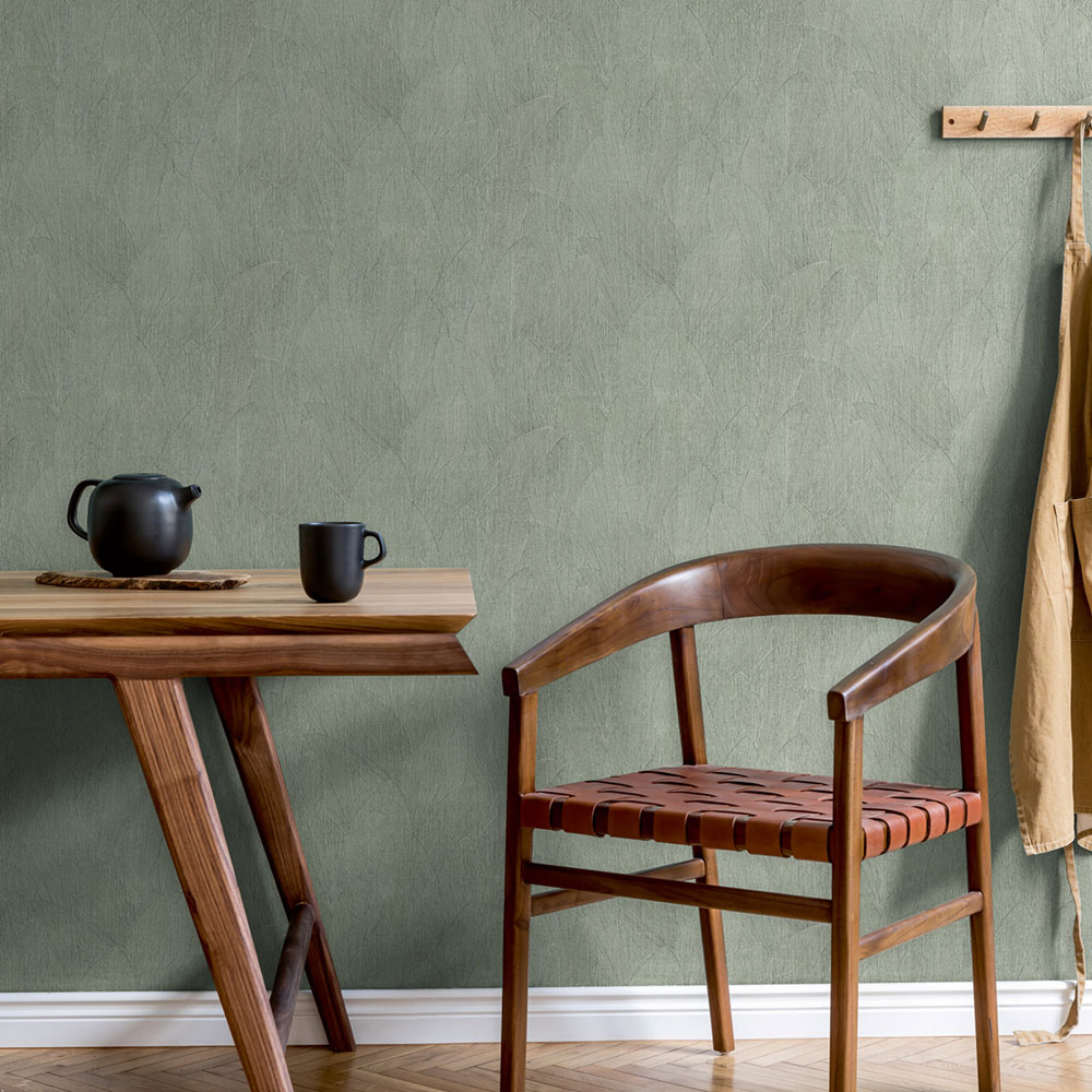 Vliesová tapeta s vinylovým povrchem, proužková textura s obrysy listů, odstíny zelené.