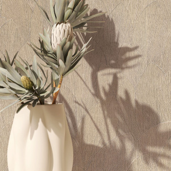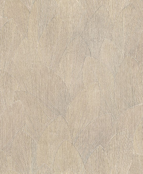 Vliesová tapeta s vinylovým povrchem, proužková textura s obrysy listů, odstíny béžové, šedo-béžové.