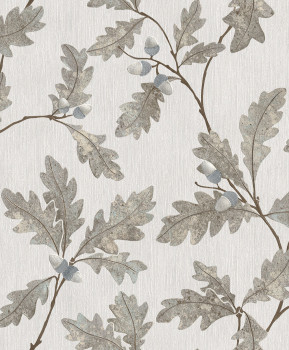 Vliesová tapeta s vinylovým povrchem, šedo-krémová proužková textura, vzor dubových větviček, odstíny šedé.