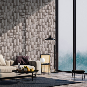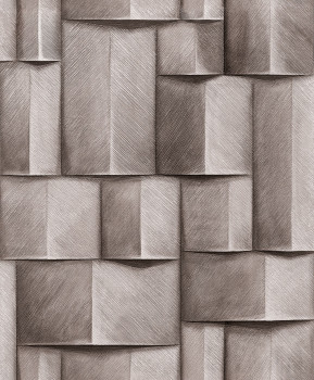 Vliesová tapeta s vinylovým povrchem, jemná textura, grafický vzor, stínování vytváří 3D efekt, odstíny hnědé, šedo-hnědé.