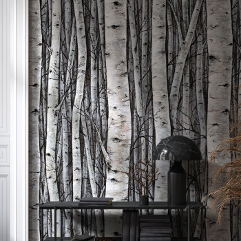 Vliesová fototapeta s vinylovým povrchem, proužková textura, vzor stromů, březového háje, v odstínech šedo-modré.