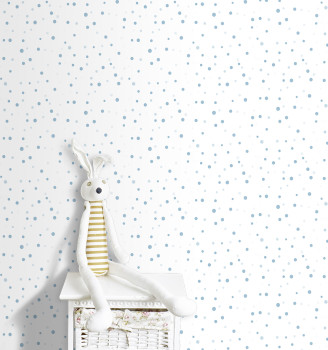 Změňte strohé stěny v útulný pokojíček, kde se vaše děti budou cítit dobře. Puntíky v modrých odstínech na bílém podkladu. Snadno kombinujte se souvisejícími tapetami.