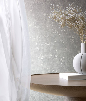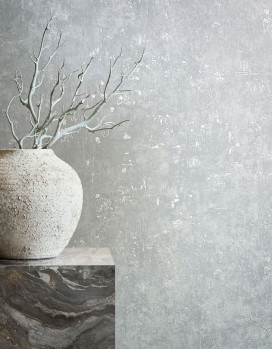 Vliesová tapeta s vinylovým povrchem, dekor štukové omítky s lesklými prolisy, odstíny šedo-modré.