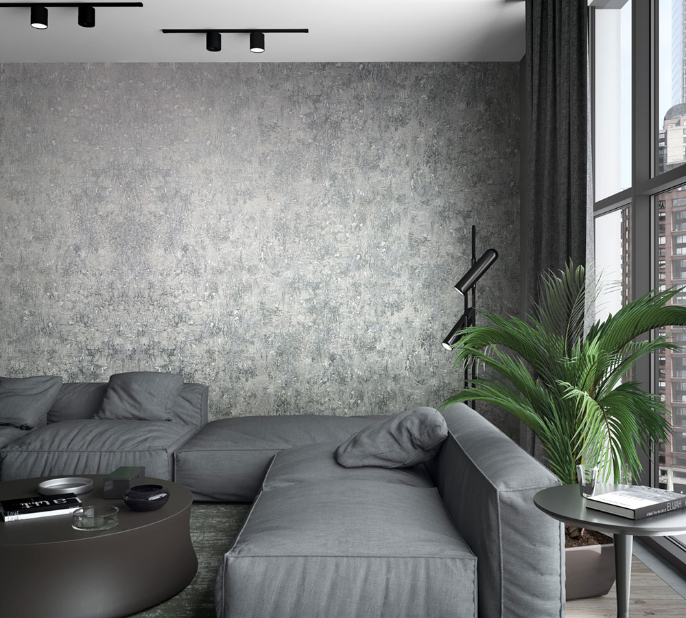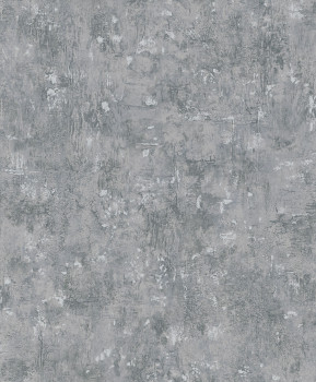 Vliesová tapeta s vinylovým povrchem, dekor štukové omítky s šedo-stříbrnými lesklými prolisy, odstíny šedé.