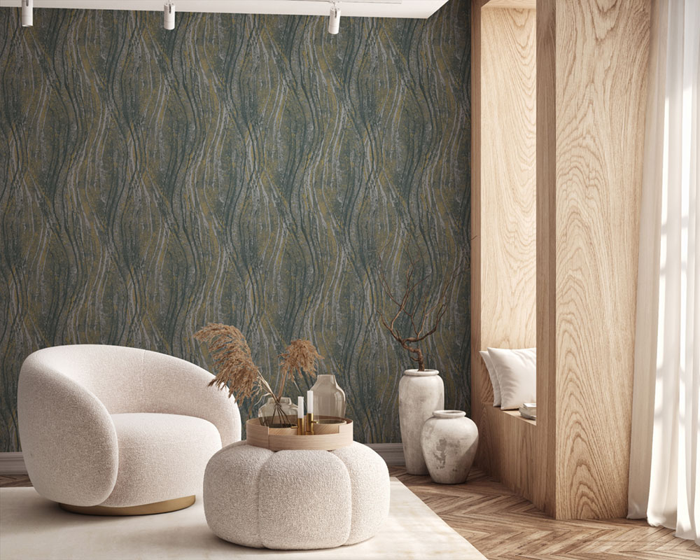 Vliesová tapeta s vinylovým povrchem, plastická textura tvoří vlny, odstíny černé a okrové.