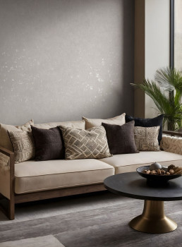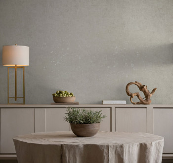 Vliesová tapeta s vinylovým povrchem, dekor štukové omítky s lesklými prolisy, odstíny šedé, šedo-béžové.
