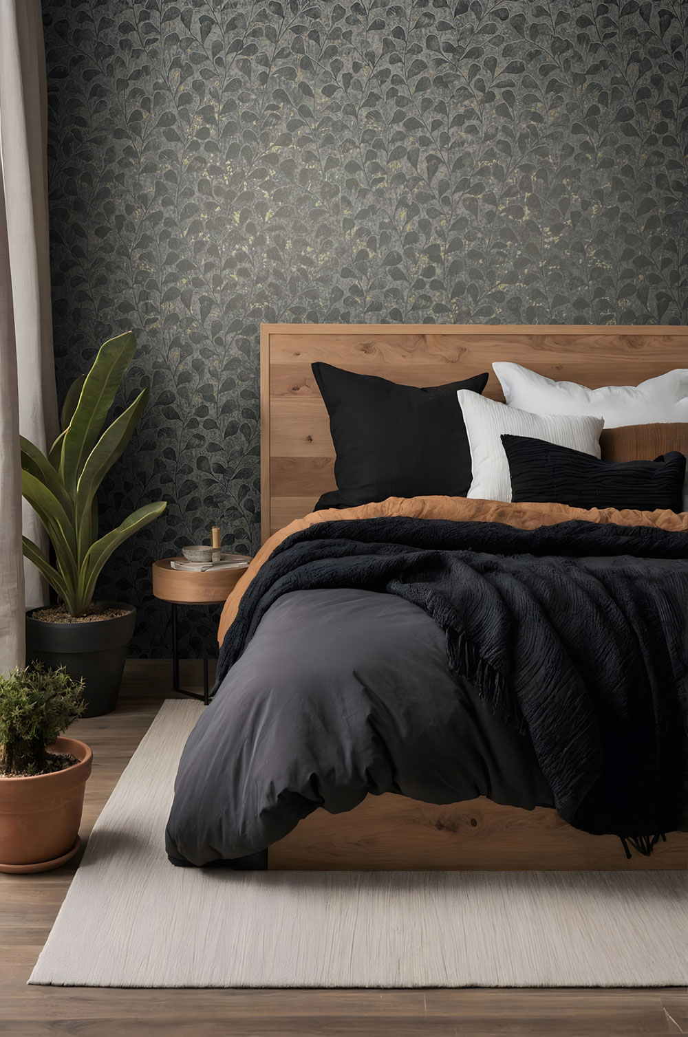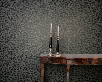Vliesová tapeta s vinylovým povrchem, prolisy větviček, odstíny černo-šedé, místy zlaté prolisy.