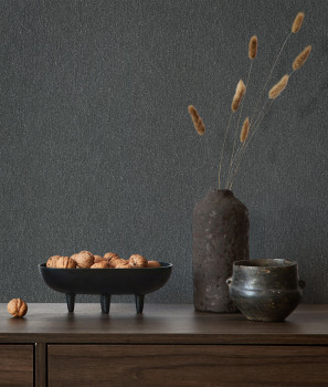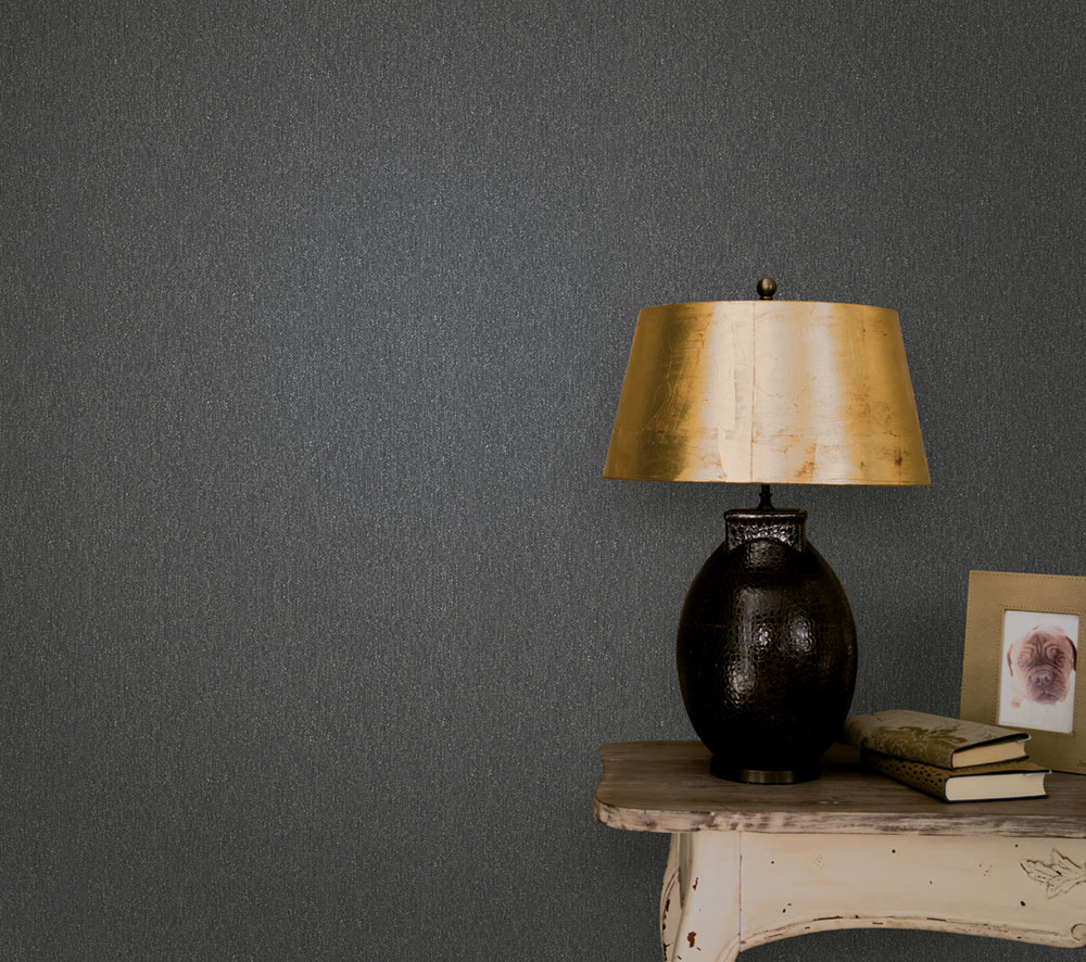 Vliesová tapeta s vinylovým povrchem, pololesklá černo-antracitová hrubší látková textura.