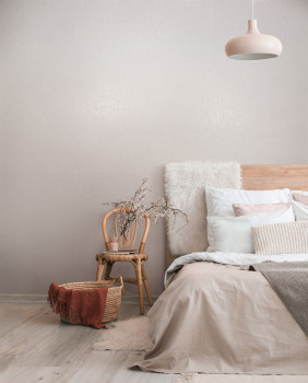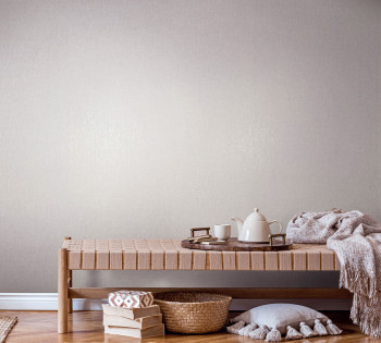 Vliesová tapeta s vinylovým povrchem, krémová a světle béžová hrubší textura, mat a prosvítající pololesklé prolisy.