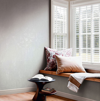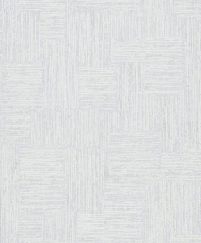 Vliesová tapeta s vinylovým povrchem, bílá hrubší textura vytváří geometrické vzory, prosvítající pololesklý podklad.