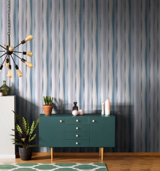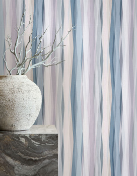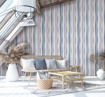 Vliesová tapeta s vinylovým povrchem, grafický vzor v odstínech šedé, modré, béžové a fialové.