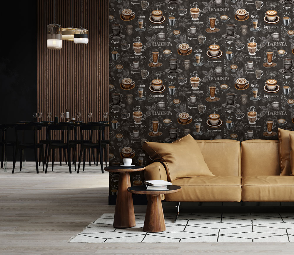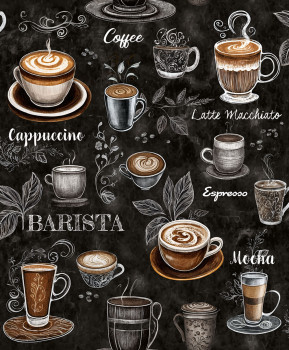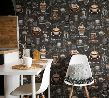 Vliesová tapeta s vinylovým povrchem, podklad černý, motivy různých druhů kávy.