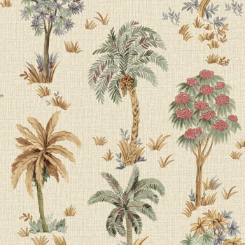 Vliesová tapeta s vinylovým povrchem, béžový podklad, motivy palem, stromů.