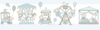 Papírová, dětská, samolepící bordura s motivy pouti-zvířátek, balónků, hvězdiček a kolotočů.
