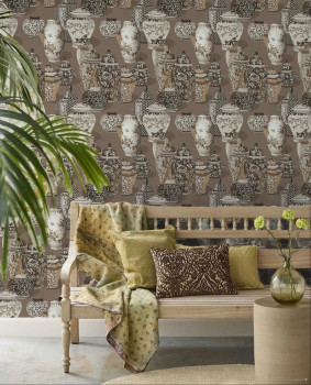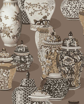 Vliesová tapeta na zeď, motivy historických nádob v odstínech hnědé, místy jemný zlato-béžový pololesk.