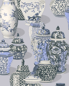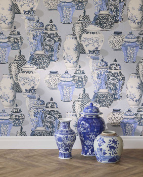 Vliesová tapeta na zeď, motivy historických nádob v odstínech šedé a modré, místy jemný modrý pololesk.